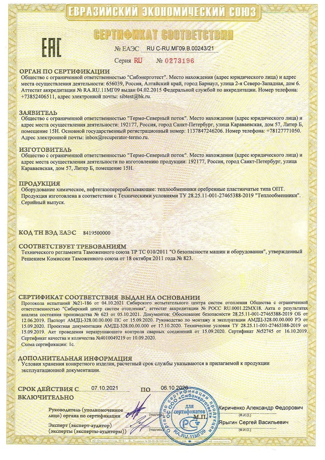 ООО «Термо-Северный поток» получил подтверждение о соответствии газовоздушных рекуператоров ОПТ стандартам ТР ТС 010/2011