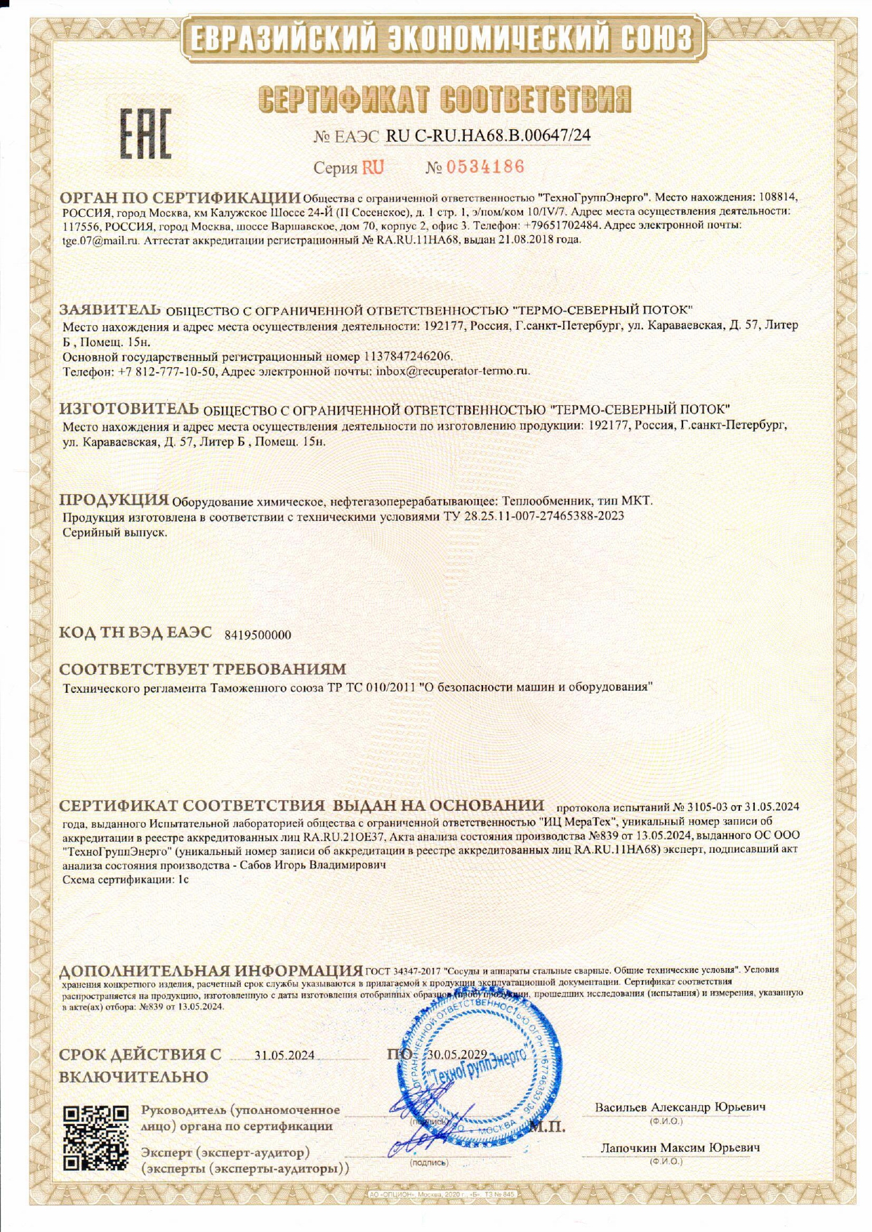 ООО «Термо-Северный поток» получил подтверждение о соответствии микроканальных теплообменников МКТ стандартам ТР ТС 010/2011